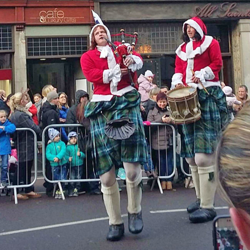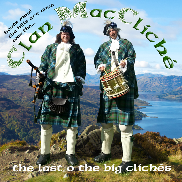 The Clan MacCliché, a big walkin, big talkin & big playin, roaming music comedy act. A fun, musical walkabout addition tae your event indoor or outdoor. Give your event a big welcome or hostin, leadin or toastin, they'll ay' pit their big feet in tae it! Takin pipin an drummin tae new heights!